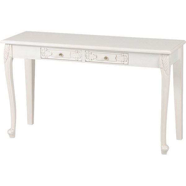 姫系 コンソールテーブル ヴィオレッタ&ウェール こんばんは。 姫系家具を紹介している『プリアンティーク♡』のJunkoです。 大きな机は必要ないけれど、ちょっと書き物ができる机がほしい。 そんな時はコンソールテーブルが便利です。 【ウェールコンソールテーブル】幅106.5×奥行41×高さ74.5cm コンソールテーブルは奥行が浅く40~41cmほどの幅が一般的です。 引出しがついていて見た目の重くないスッキリとした印象があります。 ウェールのコンソールテーブルは姫系に人気の猫脚です。 曲がった脚は細く華奢なイメージがあります。 ノートパソコンを置くこともできますし、日記などちょっとした書き物に最適です。 引出し付きなのでペンやノートなど小物が収納できて便利です。 サイズ:幅106.5×奥行41×高さ74.5cm ウェールのコンソールテーブルはブラウン系のアンティーク調です。 シンプルで落ち着きがあります。 落ち着きのある見た目はご主人の書斎などにもピッタリするデザインです。 『ウェールコンソールテーブル』はこちら (約)幅120×奥行40×高さ70cm 『ヴィオレッタコンソールテーブル』はこちら 姫系家具に多い白を基調としたコンソールテーブルです。 姫系家具の中でも人気の猫脚のデザイン。 引出しと猫脚には彫刻が施されています。 また引出しの取っ手はゴールドとなっているおしゃれなアクセント。 シンプルなデザインですがエレガントさがあり上品なイメージがあります。 どちらも幅40cm~41cmと浅目の奥行です。 コンソールテーブルはちょっとした作業に便利なサイズ。 奥行が浅目で一人暮らしのワンルームや2DKなどのお部屋にピッタリのサイズです。 その他の『姫系 コンソールテーブル』はこちら [0回]