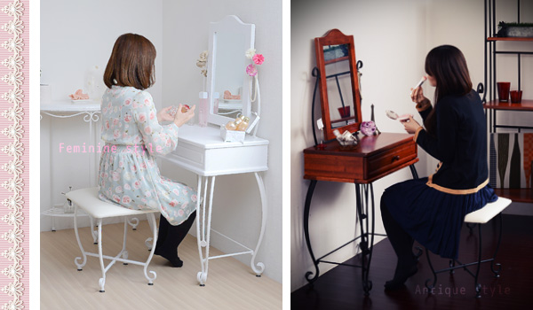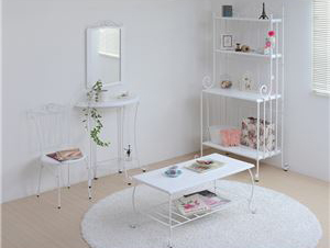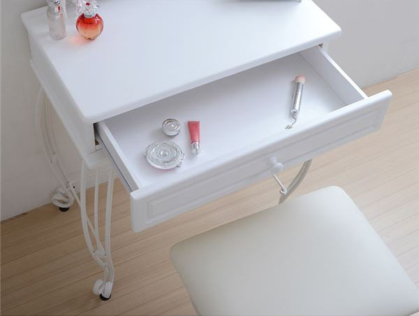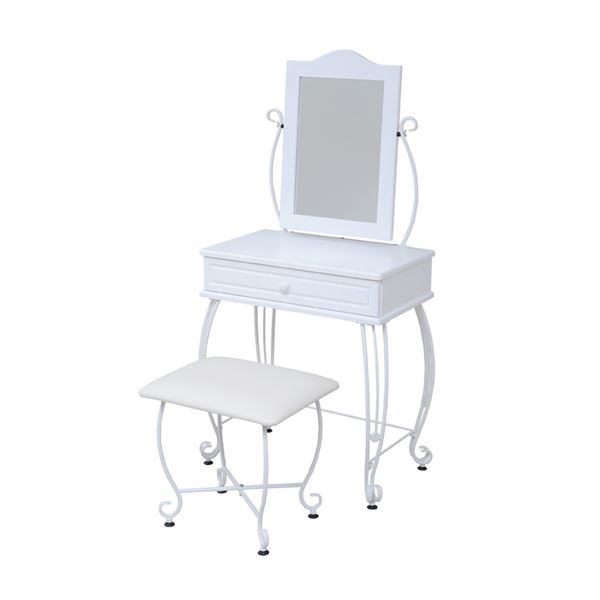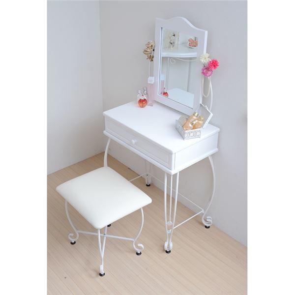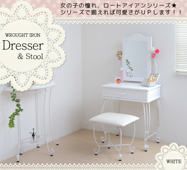 姫系ドレッサー アイアンドレッサー ホワイト こんばんは。 姫系家具を紹介しているアラフィフネットショップオーナーのJunkoです。 姫系家具の中でも人気の家具の種類にはアイアンシリーズがあります。 アイアン独特の曲線がエレガントで、細くてクルリと巻いた華奢な脚が人気です。 アイアン家具の中にはアイアンランドリーラック、アイアンデスク、アイアンチェア、 アイアンテーブル、アイアンシェルフ、アイアンドレッサーなどがあります。 今日はアイアンシリーズの中からスツール付きの「アイアンドレッサー ホワイト」 をご紹介します。 ■外寸(ドレッサー)幅67.0×奥行41.0×高さ137.5cm(スツール)幅47.5×奥行38.0×高さ45.5cm 幅67cmのコンパクトサイズのアイアンドレッサーはスツール付きです。 同じデザインのスツールなのでバランスの良い印象があります。 ・全体的に真っ白 アイアンドレッサーIIRI-0005-WH ホワイトは脚までホワイトで統一されています。 姫系の家具を揃えているお部屋には白い家具で統一されているお部屋が多いですね。 そんな白で統一されているお部屋にはピッタリのアイアンドレッサーです♡ ■内寸(引き出し)幅53.5×奥行27.5×深さ6.0cm(ミラーサイズ)幅31.0×厚み0.3×高さ45.5cm コンパクトサイズなのに小物が収納できる引き出しが一杯付いています。 深さが6.0cmあるのでメイク用品やアクセサリーがたっぷり収納できます。 仕切などを使うことで収納力がアップします。 ドレッサー本体とスツールにはアジャスターが付いているので高さ調節が出来ます。 ガタつきが生じた場合はアジャスターで調節が出来ます。 ホワイトオンリーのドレッサーだからこそ色のある小物が見栄えします♡ アイアン部分にお花やネックレスなどを飾るとさらにお洒落感が増します。 姫系ドレッサーというと木製で猫脚でどっしりとした印象のドレッサーもありますが、 アイアンドレッサーはアイアンの細い脚が魅力的な軽い印象のドレッサーです。 コンパクトサイズのドレッサーですがミラーのサイズは縦に服装チェックにも! ミラーの角度は自由に変えられます。 『アイアンシリーズ ドレッサー IRI-0005-WH』はこちら アイアンドレッサーIRI-0005-WH ・コンパクトサイズで場所を取りません ・引出し付きでメイク用品やアクセサリーが収納できます ・アジャスター付きでガタ付きを抑えます ・小物の色でアクセントがつきます ・圧迫感がありません その他の『アイアンドレッサー』はこちら [0回]