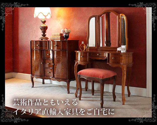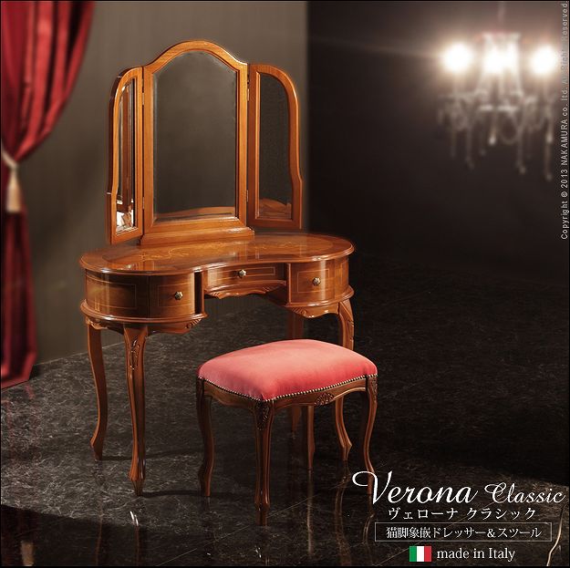 高級 姫系 ドレッサー 今日は姫系家具から、ちょっと高級な猫脚ドレッサーをご紹介したいと思います。 美しい曲線を描くフォルムが、お部屋が豪華に演出します。 艶やかで美しい天板が、さらに高級感をプラスしてくれます。 彫刻も美しい猫脚。優美でエレガントな雰囲気を醸し出します。 一つひとつが出づくりなので、象嵌も異なる風合いを楽しめます。 落ち着いた雰囲気のブラウン系。アンティーク調のドレッサーです。 『ヴェローナクラシック猫脚象嵌ドレッサー&スツール 詳細はこちら』 [0回]PR