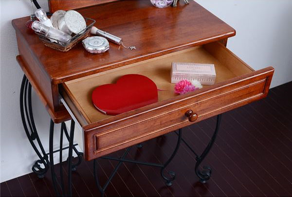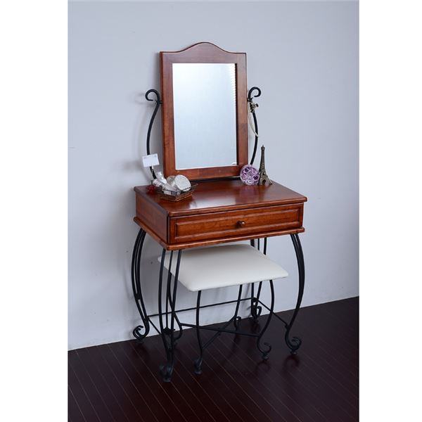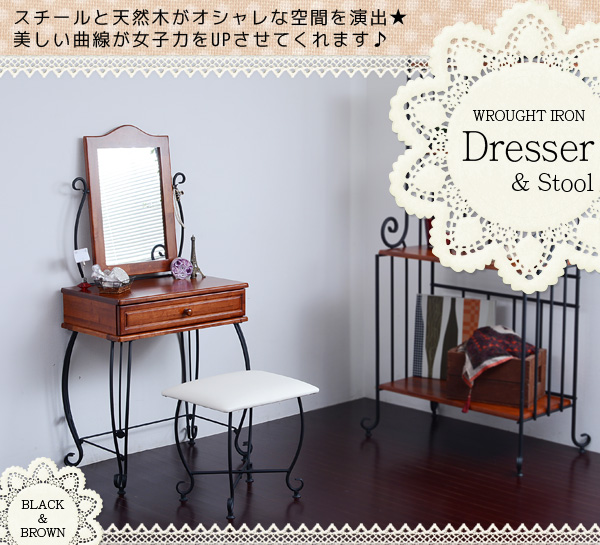 おしゃれで素敵な姫系ドレッサー こんばんは。 姫系家具を紹介しているアラフィフネットショップオーナーのJunkoです。 今日は昨日ご紹介したロートアイアンの姫系ドレッサーのブラウンのご紹介です。 ■外寸(ドレッサー)幅67.0×奥行41.0×高さ137.5cm(スツール)幅47.5×奥行38.0×高さ45.5cm 脚にアジャスターがついているので高さ調節ができ、ガタつきを調節します。 スツールにもアジャスターがついているので座ったときのゆがみを抑えます。 ■内寸(引き出し)幅53.5×奥行27.5×深さ6.0cm(ミラーサイズ)幅31.0×厚み0.3×高さ45.5cm 幅53.5cm、深さ6.0cmと広めの引き出しが一杯付いています。 メイク用品、アクセサリー、貴重品など小物を収納するのに便利です。 仕切を付けて収納することで収納力がアップします。 ミラーサイズは31.0cmと大き目なので服装チェックにも! ミラー部分は傾けられるのでメイクなどのシーンに合わせて角度を変えられます。 アイアン独特の優雅な曲線がとてもエレガントなデザインのドレッサーです。 ・ワンルームにも 幅53.5cmとコンパクトサイズなのでワンルームのお部屋でも場所を取りません。 ・圧迫感を感じにくい 木製と違いアイアンのため圧迫感が感じにくくお部屋の空間を損ないません。 ・アイアン部分にお好きなデコレーション ミラー横のアイアン部分にはお花やアクセサリーなどデコレーションすることができます。 ミラーが大き目なのでメイクをするには十分の大きさです。 角度も変えられるので好きな角度でお使いになれます。 ・アンティーク調 ブラウンはホワイトと違いアンティーク調なので落ち着いた印象があります。 『アイアンシリーズ ドレッサー IRI-0005-BK』はこちら アイアンドレッサー ・木製のドレッサーと違い圧迫感を感じにくい ・空間を損なわないデザイン ・コンパクトサイズが多いのでワンルームのお部屋にもピッタリ ・コンパクトながらに大き目の引出し付き ・同じデザインのスツール付き その他の『アイアンドレッサー』はこちら [0回]