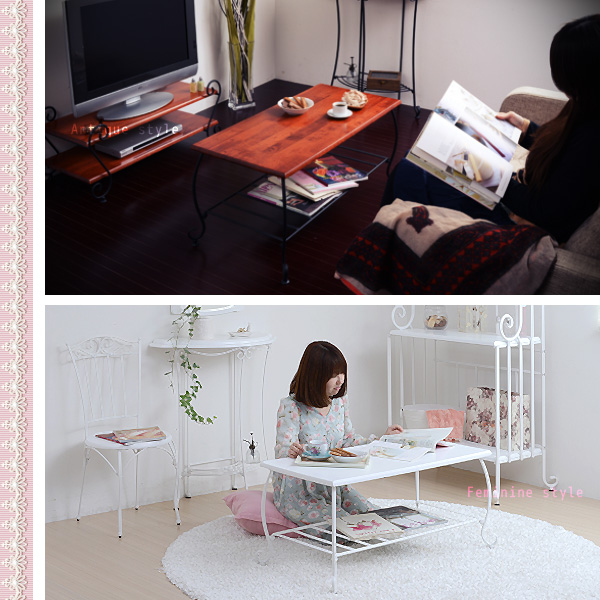 姫系 猫足 アイアンテーブル 姫系インテリアから、今日は猫足のアイアンテーブルをご紹介します。 優雅な曲線のスチール部分と、天然木で構成されるデザインが秀逸。クルっと巻いた猫足アイアンがお洒落ですね。 今まで紹介してきた猫足のテーブルは、どれも脚が太かったのですが、今回は細身のアイアンで出来ているので、優雅さがさらに増していますよね。 足部分はアジャスター付なので高さ調節ができます。ラック付なので、雑誌やティシューなども置けて収納に便利。 カラーは姫系のホワイトと、アンティーク調のブラックがあります。天板はブラウン系なのでダークな感じで、とても落ち着いた雰囲気になりますね。 他の家具と揃えたイメージが上の写真です。同じデザインの家具なのですが、色が違うだけでこんなにも雰囲気が変わるところが不思議ですね^^ こちらの家具は組み立て式です。人気は姫系のホワイトの方で、入荷待ちになることもしばしばあります。販売終了になる前に手にしてくださいね。 アイアンテーブルホワイト 詳細はこちら アイアンテーブルブラック 詳細はこちら [0回]