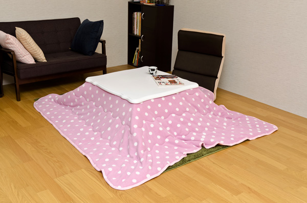 こたつは白、こたつ布団はピンクと白のバイカラーでとてもバランスがいいですね。