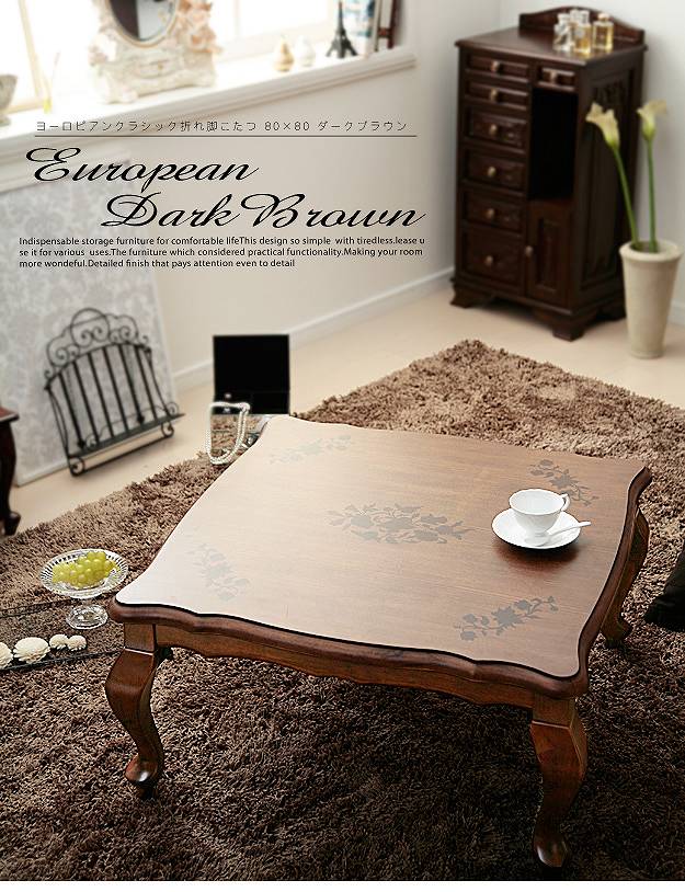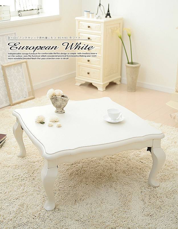 大人気の折れ脚こたつテーブル なんだか急に寒くなりましたよね? 日中は汗ばむほど暑い時間がありますが、朝と夜は寒いです。 寒くなると思い出すのが温かいコ・タ・ツ。 そこで今日は大人気の折りたたみ式のこたつをご紹介します! 正方形80×80cmの折りたたみ式のこたつです。 脚は姫系がお好きな方にも人気の「猫脚」です。 折りたたんだ時の厚さはなんと17cmの薄さ! 収納に場所を取りません! しかも、ヒーターはでっぱりの少ない薄型。 夏場にご使用の場合は、コードを仕舞う引き出しもついています。 色は、ホワイトとブラウンの2色です。 機能もデザインも大変人気のこたつです。 しかもオールシーズン使えるヒーター薄型タイプ。 エレガントでおしゃれで上品なコーロピアンクラシック折れ脚コタツです。 ブラウンはこちら ホワイトはこちら 『姫系 こたつ』はこちら [0回]