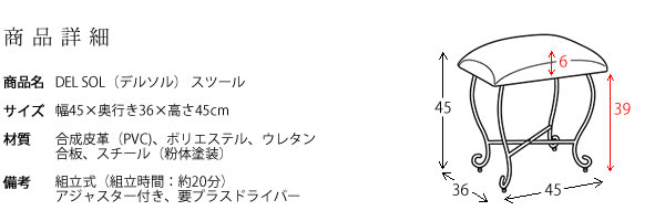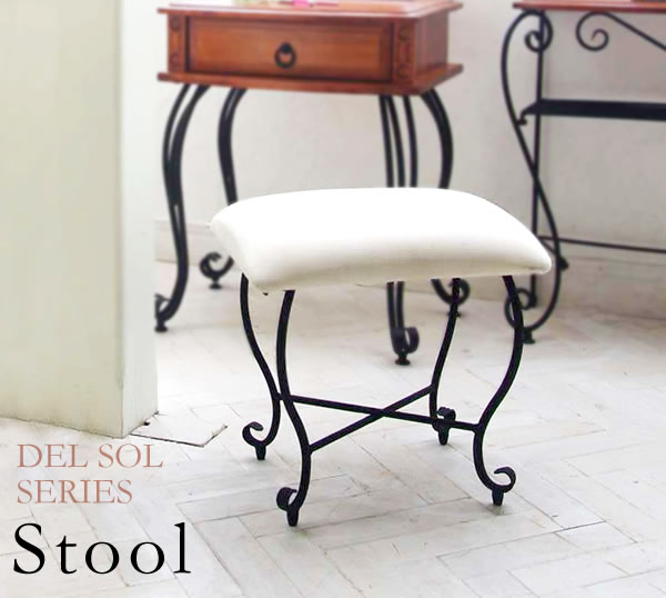 Del Sol アイアン スツール 幅45cm こんばんは。 姫系家具を紹介している『プリアンティーク♡』のJunkoです。 今夜はDel Solシリーズからスツールをご紹介します。 猫脚のようにクルっと曲線を描いた4本の脚がとてもエレガント。 幅45cm、奥行36cm、高さ45cmです。 重さは3.8キロと軽量です。 ドレッサーの椅子として、お客様がいらした時の椅子、 また玄関に置いて靴を履くときの腰掛としてもご利用いただけます。 『幅45~46cm 猫脚スツール Del Sol』詳細はこちら この商品の販売トップページはこちら [0回]