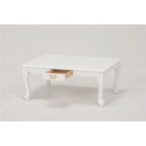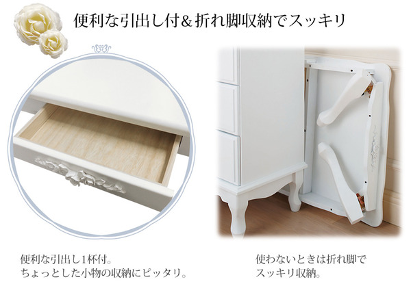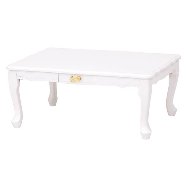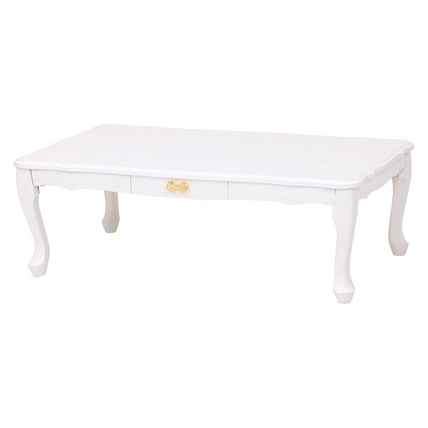 猫脚 折りたたみテーブル ローテーブル 白 こんばんは。 姫系家具を紹介している『プリアンティーク♡』のJunkoです。 折りたたみできるローテーブルはとても便利ですよね。 例えば、 ・使わない時は折りたたんで収納するので場所を取らない。 ・クローゼットのみならずソファの下、机の横など空いたスペースに収納できる。 ・お部屋を広く保ちたい時は仕舞う、使いたい時だけ出す、出し入れ簡単。 ・移動も簡単。別室に運ぶ際に脚がドアにぶつかるなど邪魔にならない。 ただ、ローテーブルは安っぽい、おしゃれじゃないというイメージはありませんか? そこで今日は姫系の猫脚折りたたみテーブルをご紹介します。 【商品サイズ(外寸)】(約)幅80×奥行55×高さ33.5cm かわいいだけではありません。見た目がおしゃれなだけではありません。 引出しがついている収納力のある折りたたみテーブルです。 【内寸及び補足説明】■ 引出内寸:(約)幅18×奥行21×深さ3.5cm 小さい引出しでも幅18cm深さ3.5cmはメモやペン、リモコンが収納できます。 小さくても使い方次第でたっぷり収納できます。 天板と幕板には緩やかなカーブがデザインされ柔らかい印象に仕上げています。 女性らしい丸みの帯びたデザインは癒やされます。 折りたたむ金属部分もしっかりした造りです。 真っ白な折りたたみテーブルのアクセントはゴールドのリボンの形の取っ手♡ シンプルだけどかわいらしい取っ手が女性らしいデザインになっています。 幅100cmのさいず違いもあります。 【商品サイズ(外寸)】(約)幅100×奥行60×高さ33.5cm【内寸及び補足説明】■ 引出内寸:(約)幅21×奥行21×深さ3.5cm 幅100cmは幅80cmのテーブルより引出しの幅は3cmほど広くなっています。 奥行は5cmほど広くなっています。 幅80cmと幅100cmのコンパクトサイズの猫脚折りたたみテーブルは 一人暮らしのワンルームや2DKほどのお部屋にピッタリです。 引出し付きで小物が収納できるのでお部屋も片付きます。 『姫系 テーブル』はこちら [0回]