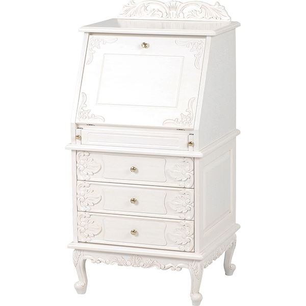 ライティングテーブル 木製 スライド棚 アンティークホワイト こんばんは。 『プリアンティーク』のJunkoです。 今日は姫系家具から真っ白なライティングテーブルをご紹介します。 高さ116cm、幅58cm、奥行52cmの真っ白なライティングテーブル。 ヨーロピアン風アンティーク調のデザインです。 脚は猫脚、取っ手は丸いゴールドのアンティーク調、 側面にはたくさんの彫刻が施されたエレガントなデザイン。 天板に電話、ファックス、花瓶などを置く事ができます。 3段の引出し付きなので収納もしっかりしています。 大変エレガントなデザインなので、女性のいるお部屋にピッタリです。 『ライティングテーブル 木製 スライド棚 アンティークホワイト』詳細はこちら この販売トップページはこちら [0回]