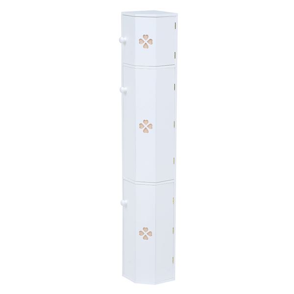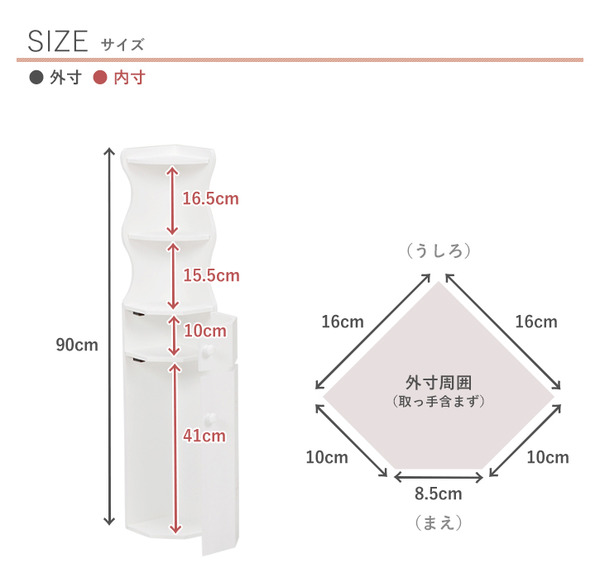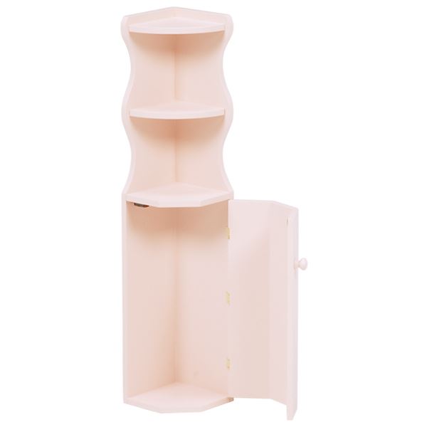 トイレラック(コーナーラック/トイレ収納棚) 幅16cm×高さ90cm スリム こんにちは。 姫系家具を紹介している『プリアンティーク♡』のJunkoです。 トイレもお部屋の一つ、最近ではそう考えられる時代になりましたよね。 長時間居てもリラックスできる、そんなおしゃれなトイレが一般家庭には増えています。 そこで必要なのがトイレラックです。 トイレの掃除用具を出しっぱなしでは正直格好悪くお洒落ではないですよね。 商品サイズ(外寸):(約)幅16×奥行16×高さ90cmオープン部内寸(上):(約)高さ16cmオープン部内寸(下):(約)高さ15cm扉内内寸(上):(約)高さ10cm扉内内寸(下):(約)幅13×奥行13×高さ41cm 『トイレラック 高さ90cm スリム 白』はこちら スリム型のトイレラックは狭いトイレにおすすめのサイズです。 しかもコーナーにピッタリの形なので場所を有効に使うため邪魔になりません。 【扉で上手に目隠し】 お洒落なトイレにしたいならお掃除用具は見せたくないですよね。 そこで一番下の扉内にはトイレブラシ(高さ41cmまで)が収納できます。 その上の扉内にはサニタリーやお掃除用品が収納できます。 扉を閉めるとおしゃれな四葉のクローバーがデザインされています。 取っ手は丸い形をしているので柔らかい印象があります。 飾り棚が三段あるので好みの小物をディスプレイして楽しめます。 トイレにグリーンの観葉植物があると爽やかな印象があり素敵ですね。 色は白(ホワイト)の他にピンクもあります。 『トイレラック 高さ90cm スリム ピンク』はこちら トイレも今ではお部屋の一つです。 おしゃれで素敵なトイレにするためトイレラックでスッキリさせましょう! その他の『姫系 トイレタリー』はこちら [0回]