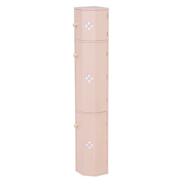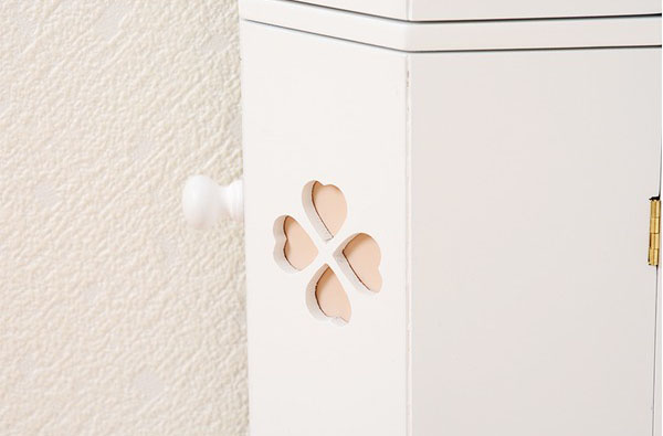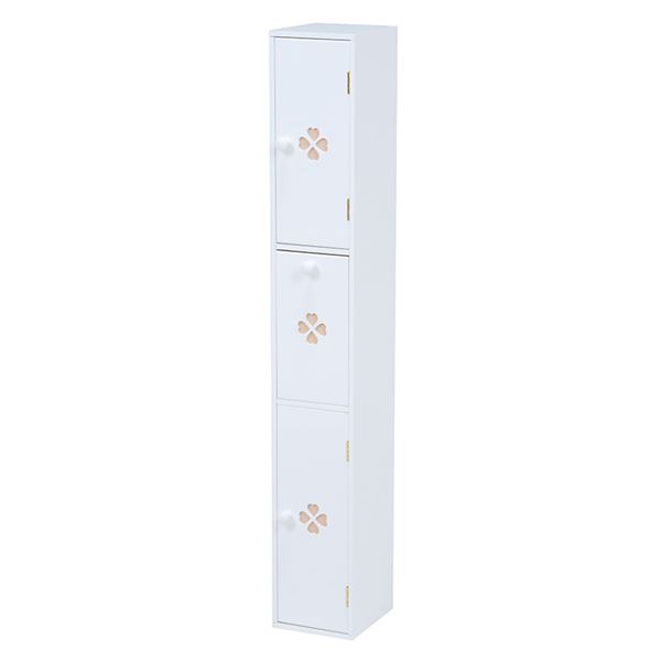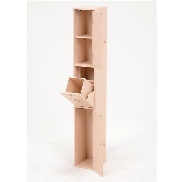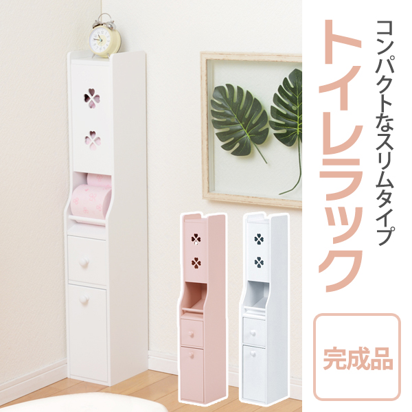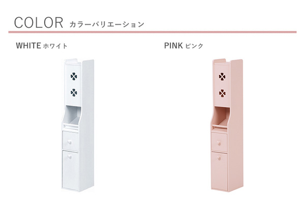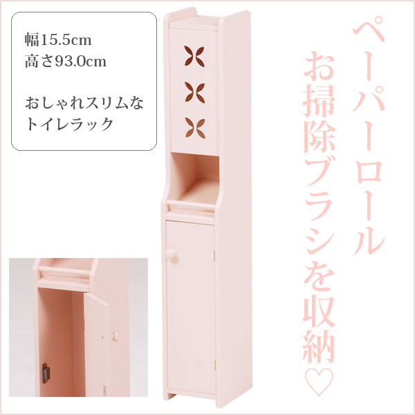 トイレラック(トイレ収納) 幅16cm×奥行18cm スリム ゴミ箱付き こんにちは。 姫系家具を紹介している『プリアンティーク♡』のJunkoです。 最近は「トイレもお部屋の一つ」という時代です。 そこで最近はずっとおしゃれなトイレラックをご紹介しています。 今日はスリムだけどトイレブラシもゴミ箱も収納できるトイレラックをご紹介します。 【商品サイズ(外寸)】(約):幅16×奥行18×高さ107cm 『幅16cm トイレラック ゴミ箱付き ピンク』はこちら ・幅16cm奥行18cmとスリム型なので狭いトイレにも置けるサイズです。 ・色は淡いピンクでやわらかい印象があります。 ・3枚の扉にデザインされたクローバーがおしゃれです。 下段の扉内にはトイレブラシが収納できるようになっています。 中央はダストボックス(ゴミ箱)が備えられています。 上2段の引き出しにはサニタリー用品や掃除用品、また予備のタオルなど収納できます。 棚板は可動式となっているので収納物の高さに合わせて調節できます。 ゴミ箱は取り出せるようになっているのでゴミ捨てが簡単です。 色違いのホワイトもあります。 『幅16cm トイレラック ゴミ箱付き ホワイト』はこちら ホワイトは姫系家具の中でも人気のカラーです。 トイレの壁が白い場合はトイレラックも白にすることで圧迫感が少なくなります。 狭いトイレなら尚更のこと、壁とトイレラックを同色系にすると違和感がありません。 まとめ 【トイレをお洒落にするために】 トイレにブラシやダストボックスを床に直接置くとスッキリ見えません。 狭いトイレなら尚更です。 そこでお掃除用具のブラシや洗剤、ダストボックスを収納棚に入れてスッキリ! スッキリすると片付きますし、片付いたトイレはどこかお洒落感があります。 また壁の色に合わせたトイレラックを使うことで圧迫感が少なくなります。 狭いトイレなら壁と同色系の色を選ばれると狭さがカバーできます。 ※開き戸の場合は扉部分のスペースが必要となります。ご注意ください。 その他の『姫系 トイレタリー』はこちら [0回]