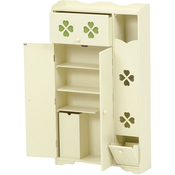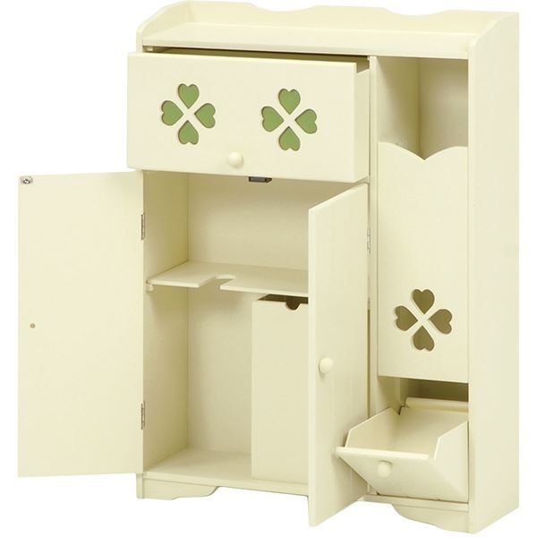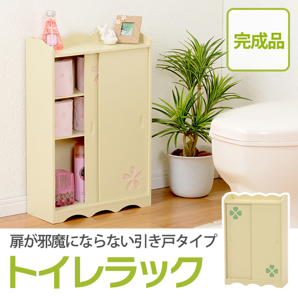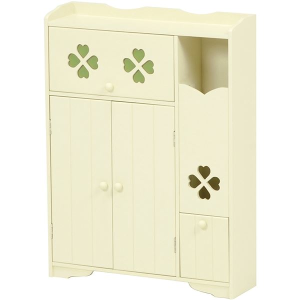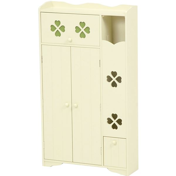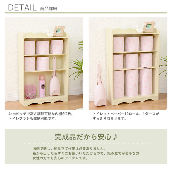 カントリー調トイレラック クローバー 木製 可動棚付き こんにちは。 姫系家具を紹介している『プリアンティーク♡』のJunkoです。 トイレもお部屋の一つ、そう考える今の時代ではトイレもおしゃれにしたいですね。 姫系家具で揃えているお部屋なら、トイレも姫系にしたいとことです。 そこでトイレをスッキリさせるおしゃれな収納棚トイレラックをご紹介します。 商品サイズ(外寸):(約)幅50×奥行14×高さ67cm引出内寸:(約)幅33×奥行11×深さ14cm扉内内寸(上):(約)幅33×奥行11×高さ15cm扉内内寸(下):(約)幅33×奥行11×高さ25cm可動棚:1枚 『カントリー調トイレラック 幅50cm』はこちら トイレブラシ、トイレ用掃除用品、サニタリー用品、トイレットペーパーなど、 たっぷり収納できる収納力抜群のトイレラック。 淡いクリーム系の癒しカラー、クローバーのデザインがシンプルでお洒落です。 左サイドには約5コほどのトイレットペーパーが収納できる棚。 下の扉を引く事で取り出すことができます。 右サイドの上段の引出しにはサニタリーや掃除用具など小物が収納できます。 下の扉を開けると使用済みのサニタリー用品など捨てるダストボックスがあります。 ラックと同色なので自然な感じがいいですね。 ゴミ箱の横にはトイレブラシが収納できます。 棚は可動棚となっているので収納物に合わせて高さ調節ができます。 天板にはお気に入りのディスプレイを飾ることができます。 観葉植物や時計、芳香剤やフォトスタンドなど置くとお洒落です。 幅50cmほどある大き目サイズは少々広めのトイレにおすすめのサイズです。 同じカラー、同じデザインですが高さ違いのトイレラックもあります。 品サイズ(外寸):(約)幅50×奥行14×高さ87.5cm引出内寸:(約)幅32×奥行11×深さ13cmダストボックス内寸:(約)幅10×奥行11×深さ23cm扉内内寸(上):(約)幅33×奥行11×高さ11cm扉内内寸(下):(約)幅33×奥行11×高さ25cm可動棚:2枚、固定棚:1枚 『カントリー調トイレラック 高さ87cm』はこちら 高さが87cmほどあるのでトイレットペーパーは約8コ収納できます。 扉内には棚が3枚、中央は固定棚となりあとの2枚は可動棚となります。 ダストボックスもあります。 小物など収納物の多いご家庭におすすめの高さです。 【商品サイズ(外寸)】(約)幅40×奥行16×高さ60cm【内寸及び補足説明】 ■ 扉内内寸:(約)幅38×奥行12×高さ51cm■ 可動棚:2枚・4cmピッチ 『幅40cm クローバートイレラック』はこちら 2枚の可動棚は4cmピッチで収納物の高さに合わせて調節できます。 トイレブラシを収納するスペースもあります。 引き戸となっているので狭いトイレでも扉が邪魔になりません。 幅40cmほどなので狭いトイレでも収納可能。 開き戸と違い引き戸の場合は収納物を取るとき余計なスペースを必要としません。 【商品サイズ(外寸)】(約)幅60×奥行16×高さ60cm【内寸及び補足説明】 ■ 扉内内寸:(約)幅28×奥行12×高さ51cm■ 可動棚:4枚・4cmピッチ 『幅60cm クローバートイレラック』はこちら 同カラー、同デザインで幅60cmタイプもあります。 トイレブラシを収納するスペース、可動棚は同じです。 たくさん収納物があるご家庭には幅60cmのトイレラックがおすすめです。 たっぷり収納することでトイレ周りがスッキリ片付きます。 トイレラックを活用してトイレルームがスッキリします。 飾り棚にお好みのディスプレイを飾ってお洒落なトイレに出来ます。 その他の『姫系 トイレ』はこちら [0回]