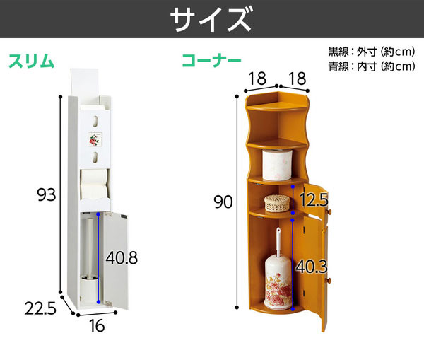 おしゃれな南欧風トイレラック おはようございます。 姫系家具を紹介している『プリアンティーク♡』のJunkoです。 トイレもお部屋の一つです。 だからこそスッキリさせて清潔でおしゃれにしたいですね。 スッキリさせるというと「トイレラック」を活用するとスッキリしますね。 そこで今日は南欧風のおしゃれなトイレラックをご紹介します。 『南欧風 スリム型 トイレラック ブラウン』はこちら 天板には小物をディスプレイできるスペースになっています。 トイレットペーパーラックもあり5コほど収納できます。 下の扉内にはトイレブラシが収納できます。 向って左がこのサイズです。 幅16cm、奥行22.5cm、高さ93cm、ブラシ収納サイズは40.8cmです。 コーナーにもすっぽり収まるスリム型なので狭いトイレにもおすすめです。 ※開き戸となっているので扉のスペースが必要となります。 トイレブラシが直接床に置く事でお掃除の邪魔になります。 トイレラックに収納することでお掃除も捗りますね。 色違いのホワイトもあります。 『南欧風 スリム型 トイレラック 白』はこちら 白というと姫系家具の中でも一番人気の色です。 トイレの壁が白の場合は白いトイレラックを使用することで圧迫感が少なくなります。 特に狭いトイレの場合は壁と同色系のトイレラックを選ぶことで狭さがカバーできます。 その他の『姫系 トイレタリー』はこちら [0回]