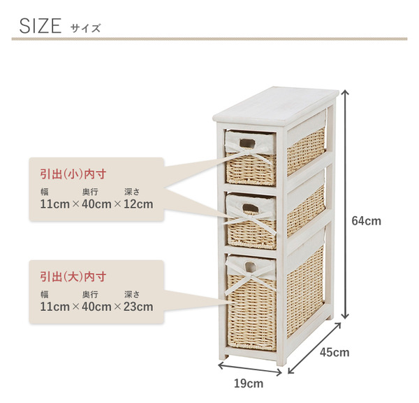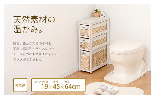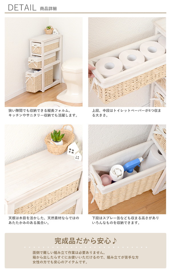 トイレラック/トイレ収納棚【幅19cm】バスケット収納【完成品】 こんばんは。 姫系家具を紹介している『プリアンティーク♡』のJunkoです。 トイレもお部屋の一つ。 トイレにトイレラックがあるとスッキリ片付いていますよね。 トイレブラシやトイレ洗剤などが床に直接置いてあるとお洒落感ないですよね。 だからこそトイレラックを活用しておしゃれなトイレにしたいです。 商品サイズ(外寸):(約)幅19×奥行45×高さ64cm引出内寸(小):(約)幅11×奥行40×深さ12cm引出内寸(大):(約)幅11×奥行40×深さ23cm 『トイレラック【幅19cm】バスケット収納 白』はこちら バスケットタイプなのでトイレラックとは思えないおしゃれなデザイン。 バスケットにリボンも付いていて可愛さもアップ! バスケットは全部で3つ。 天板にはお気に入りの小物がディスプレイできます。 高さ64cmのトイレラックには深さ12cmが2カゴ、深さ23cmと3カゴあります。 奥行40cmがあるのでトイレットペーパーは4つほど収納できます。 下段のカゴは深さ23cmあるのでトイレ用洗剤など背の高い小物が収納できます。 さらに高さのあるトイレブラシなどは天板に置く事もできます。 そうすることで床面がスッキリしてトイレのお洒落感が出てきます。 カゴにはサニタリー用品やトイレ用掃除用具など小物も収納できます。 色違いのナチュラルもあります。 『トイレラック【幅19cm】バスケット収納 ナチュラル』はこちら トイレラックとは思えないほどのおしゃれなデザインです。 お部屋に収納ラックとしてもご利用いただけます。 その他の『姫系 トイレタリー』はこちら [0回]